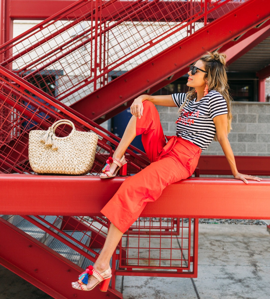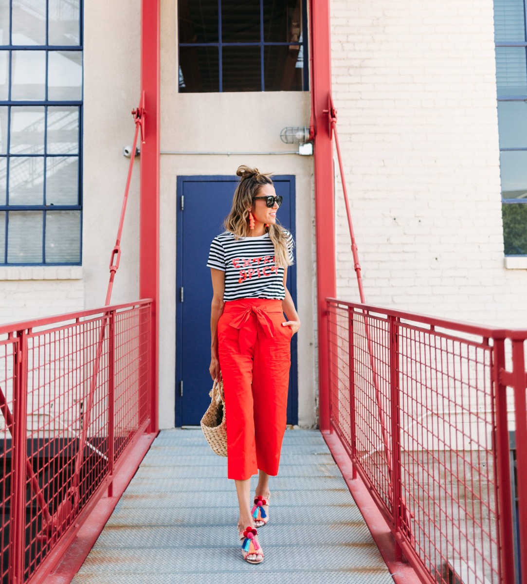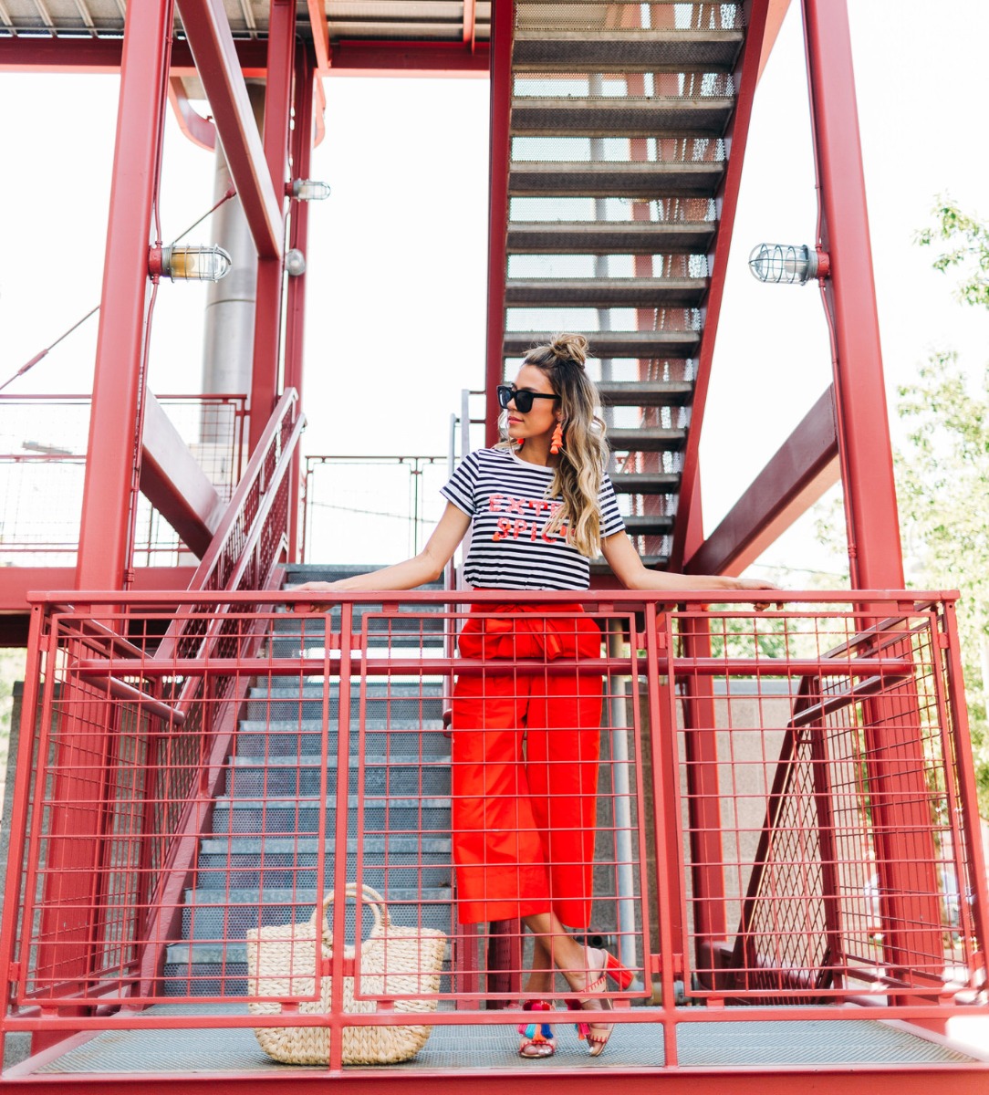 It’s a common joke in the house that when I get passionate about things I get really animated, move my hands around a lot, or raise my voice (when I’m not even mad). Or when we argue (yes we argue haha and it’s usually over really dumb things), Cody always teases me that I can get feisty and attributes it to my ‘spicy latin blood’ (I’m half Colombian – so when I saw this shirt I had to get it and it looks even better in person. I love the intersection of a graphic tee with embellishment – how good are these tassels! I definitely haven’t been shying away from bright colors lately. I love these bold red Kate Spade pants and they are actually really versatile! I’ve already worn them multiple times. And the statement bow totally makes them unique and a statement piece. And of course the shoes! I never shy away from pom poms!! Obsessed with these sandals!